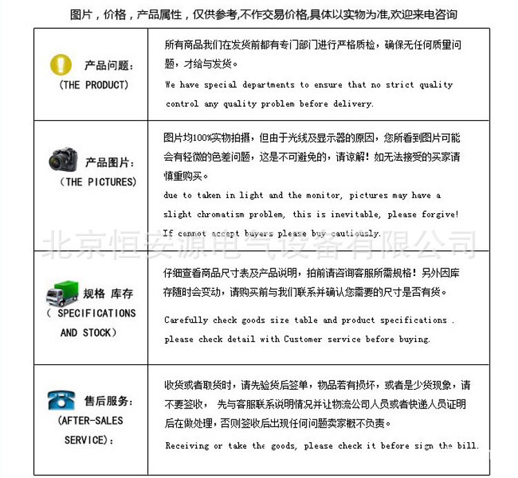 1.我公司對生產(chǎn)的全部產(chǎn)品實(shí)行“三包”,保證產(chǎn)品采用較佳材料和一流工藝,符合合同規(guī)定的質(zhì)量﹑規(guī)定和性能要求。保證其合同設(shè)備經(jīng)過正確安裝﹑合理操作和維護(hù)保養(yǎng),在合同設(shè)備使用期內(nèi)運(yùn)轉(zhuǎn)良好,在規(guī)定的質(zhì)量保證期內(nèi),對由于設(shè)計(jì)工藝或材料的缺陷而造成的故障負(fù)責(zé),免費(fèi)負(fù)責(zé)修理或更換有缺陷的電器元件。